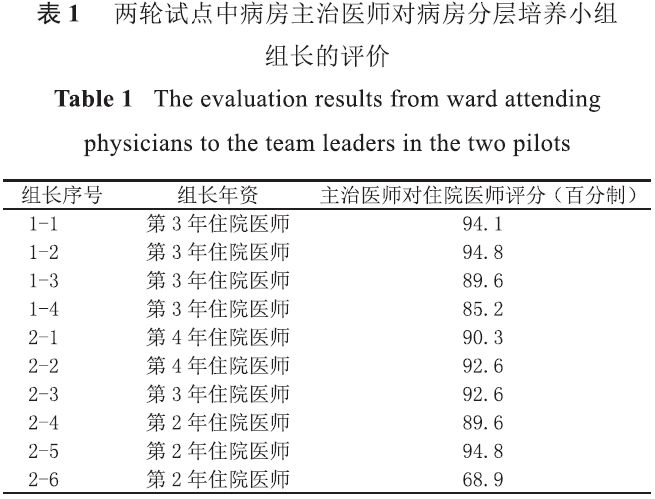 2.1.1 确立分层培养小组组长 北京协和医院内科病房分层培养小组组长由第2年及以上的内科住院医师担任,参考“推荐制度”结果来确认,即需在360度评估系统累计获得6个月及以上“可担任病房分层培养小组组长”评价者。住院医师是否具有担任小组组长的资格由总住院医师在每月换班前确认,并由负责排班的总住院医师合理安排,使每个医疗组有1名小组组长。