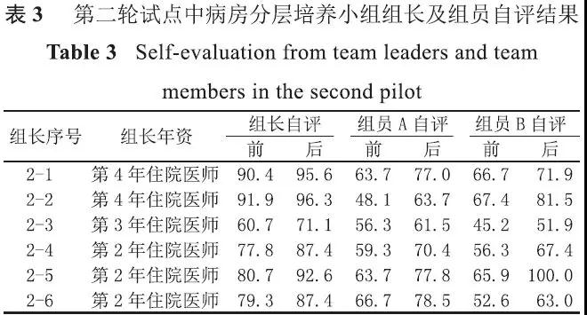 对于组长的工作,在第1轮试点中搜集了组员对组长胜任力的评估,见表2。在第二轮试点中搜集了组长对自己前后表现的评估,见表3。值得欣喜的是,尽管数据量较小,但从大体上可以看出组员对组长的工作很满意,而组长也都认为自己有所成长。在一对一的访谈中,组长均反馈个人能力得到了提升,尤其是临床决策能力、协调能力、领导能力和统筹规划能力,更好地进行自我定位。对比以前扁平化的培养模式,新的分层培养小组模式在很大程度上锻炼了住院医师不同层面的胜任力。