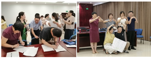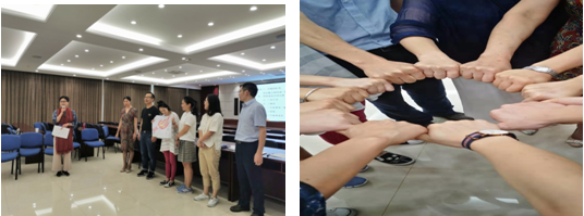 此次讲座打破原有课桌式的形式,在轻松自由的环境下开展。邢静南教授以“现在的你感觉如何?”为开篇,大家纷纷作答,很快营造了一种轻松愉悦的氛围,并通过开展“顾此失彼”、“BINGO”、“千千结”、 “石头剪刀布”等系列活动使大家兴趣盎然地投入到活动中,团员之间互相信任和配合,最后通过分组团队的形式,为自己的团队起一个口号、画一幅画、编一个故事或者一首诗、唱一首歌及组一个队形。