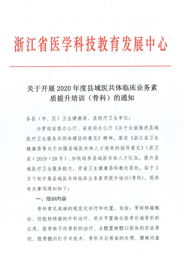 关于开展2020年度县域医共体临床业务素质提升培训(骨科)的通知
