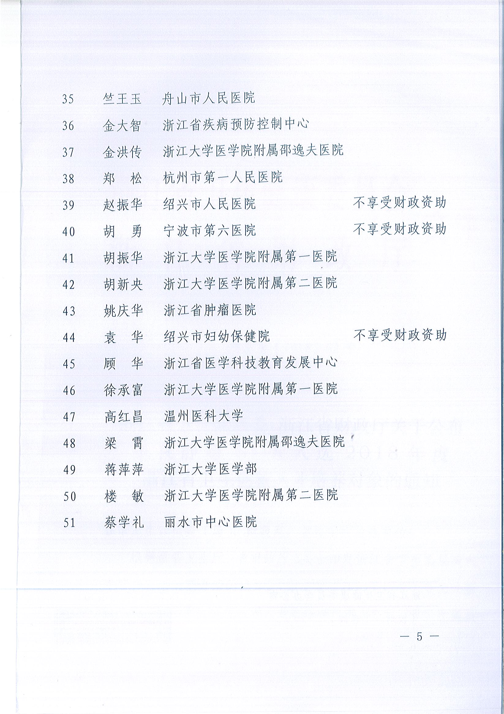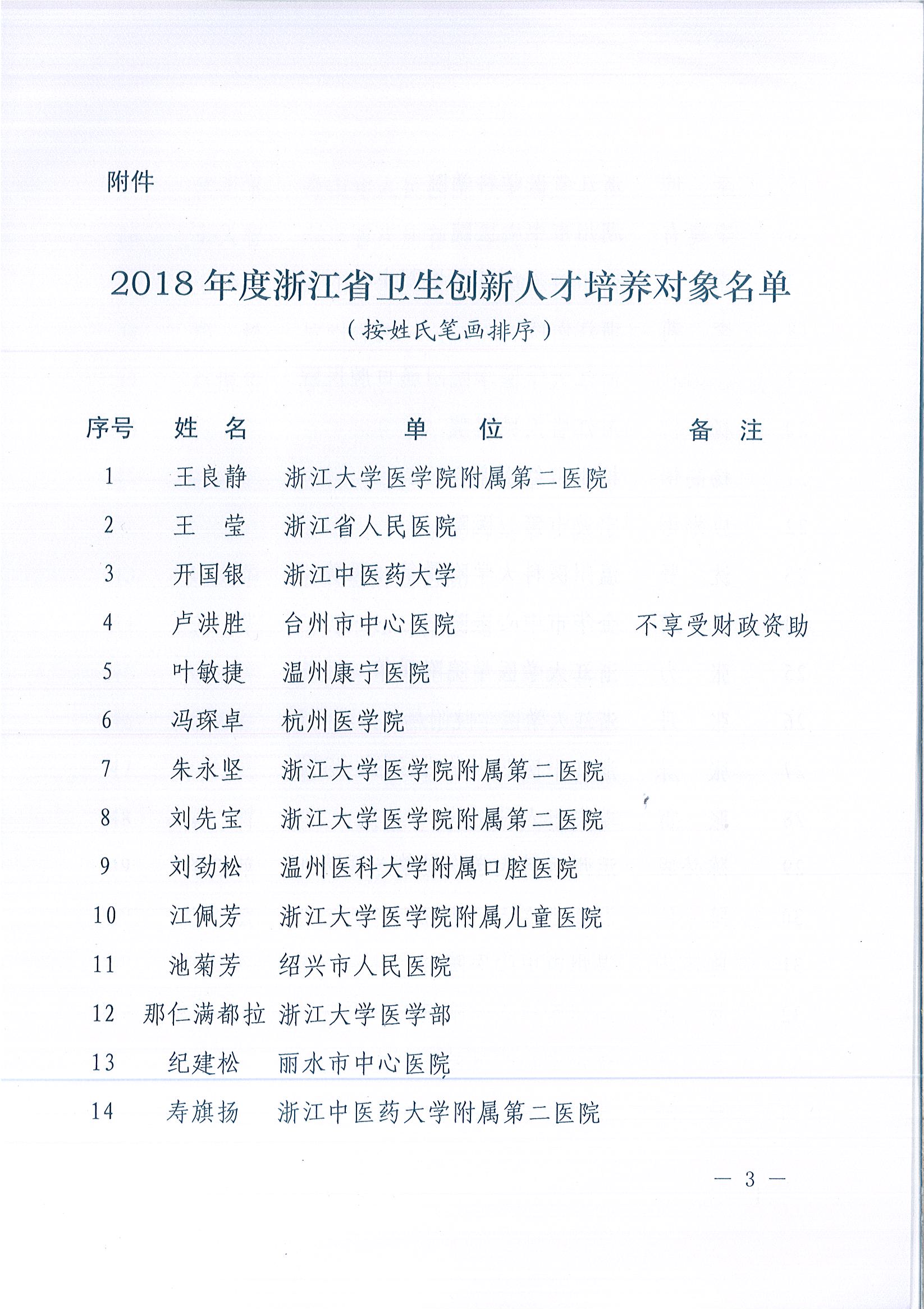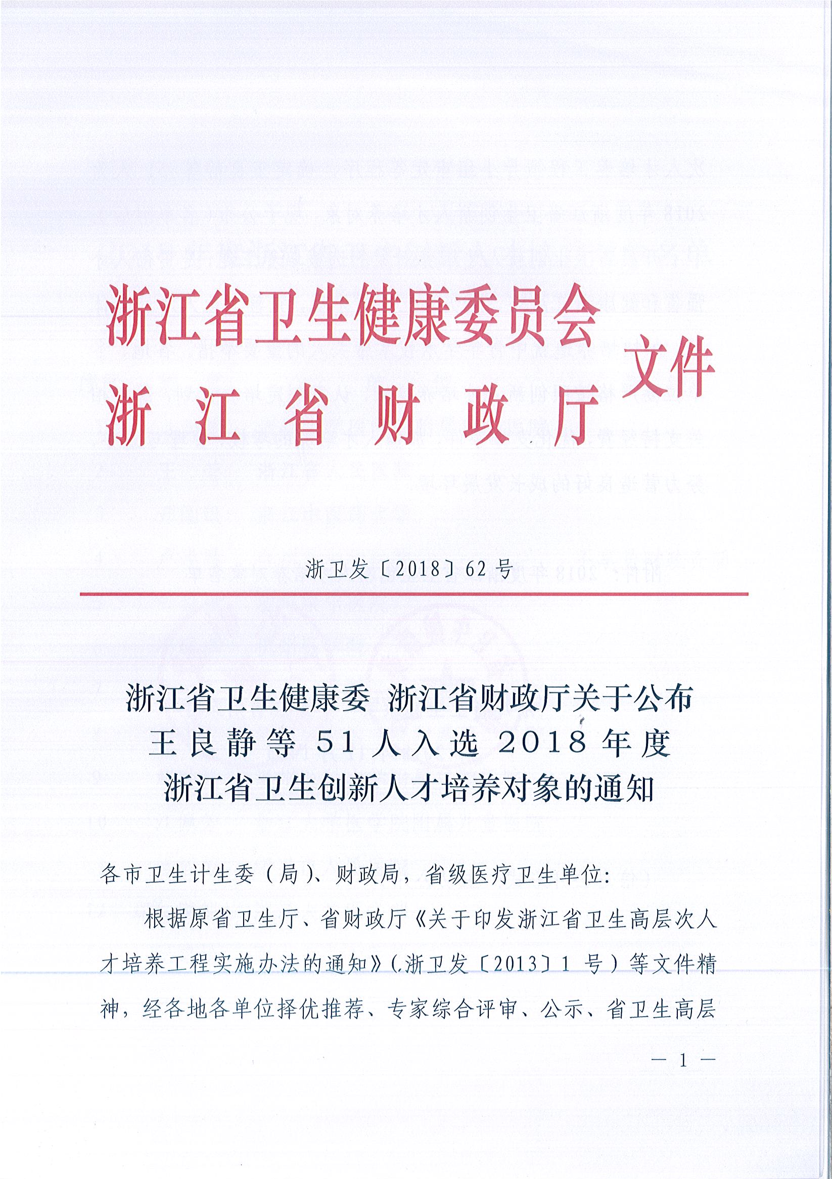 浙江省卫生健康委 浙江省财政厅关于公布 王良静等51人入选2018年度 浙江省卫生创新人才培养对象的通知